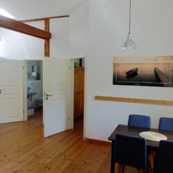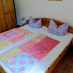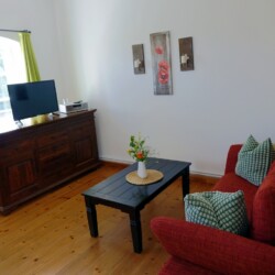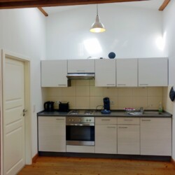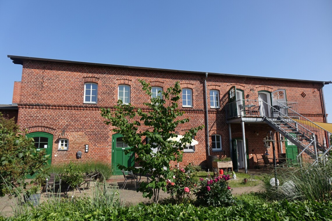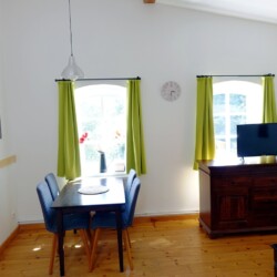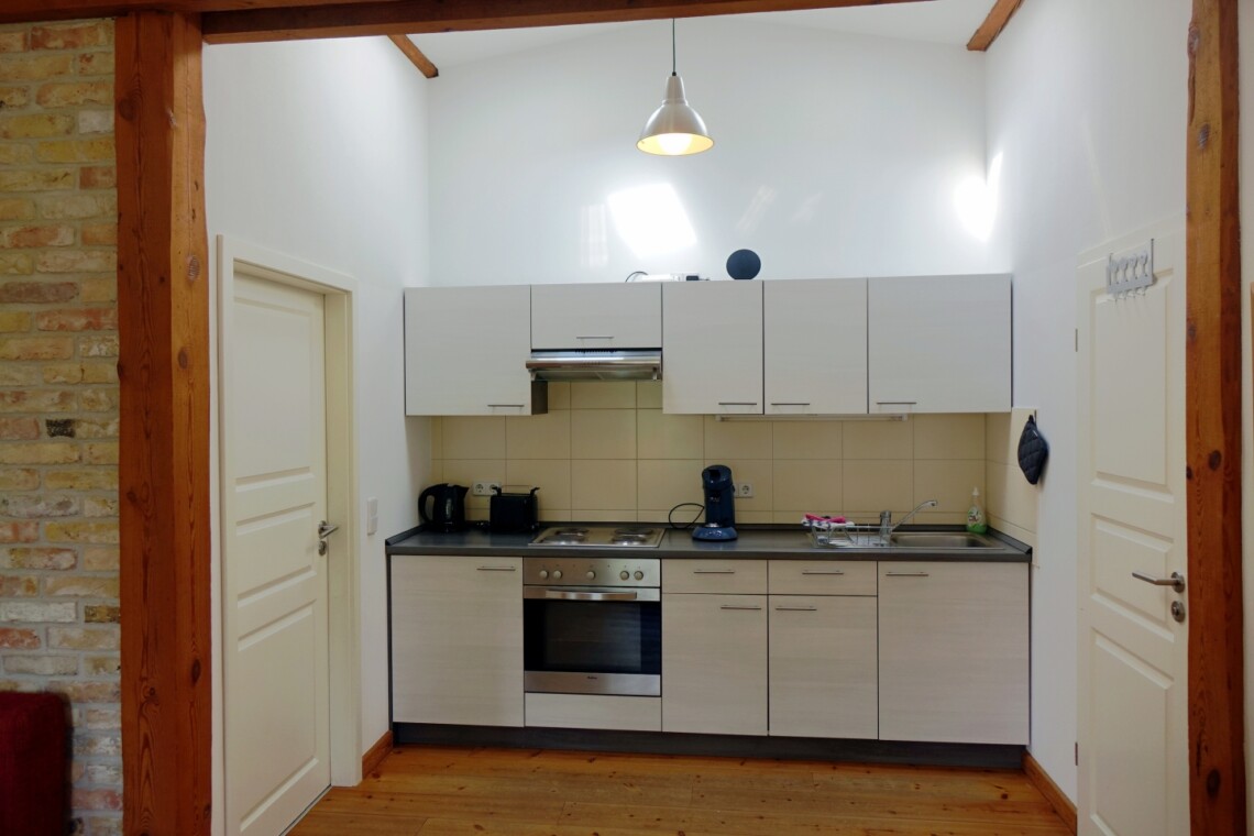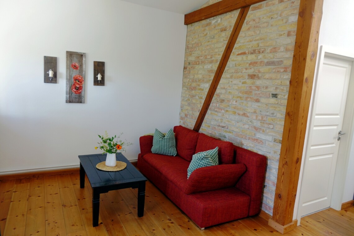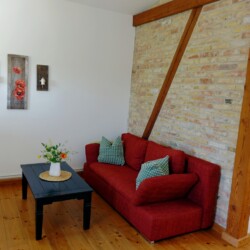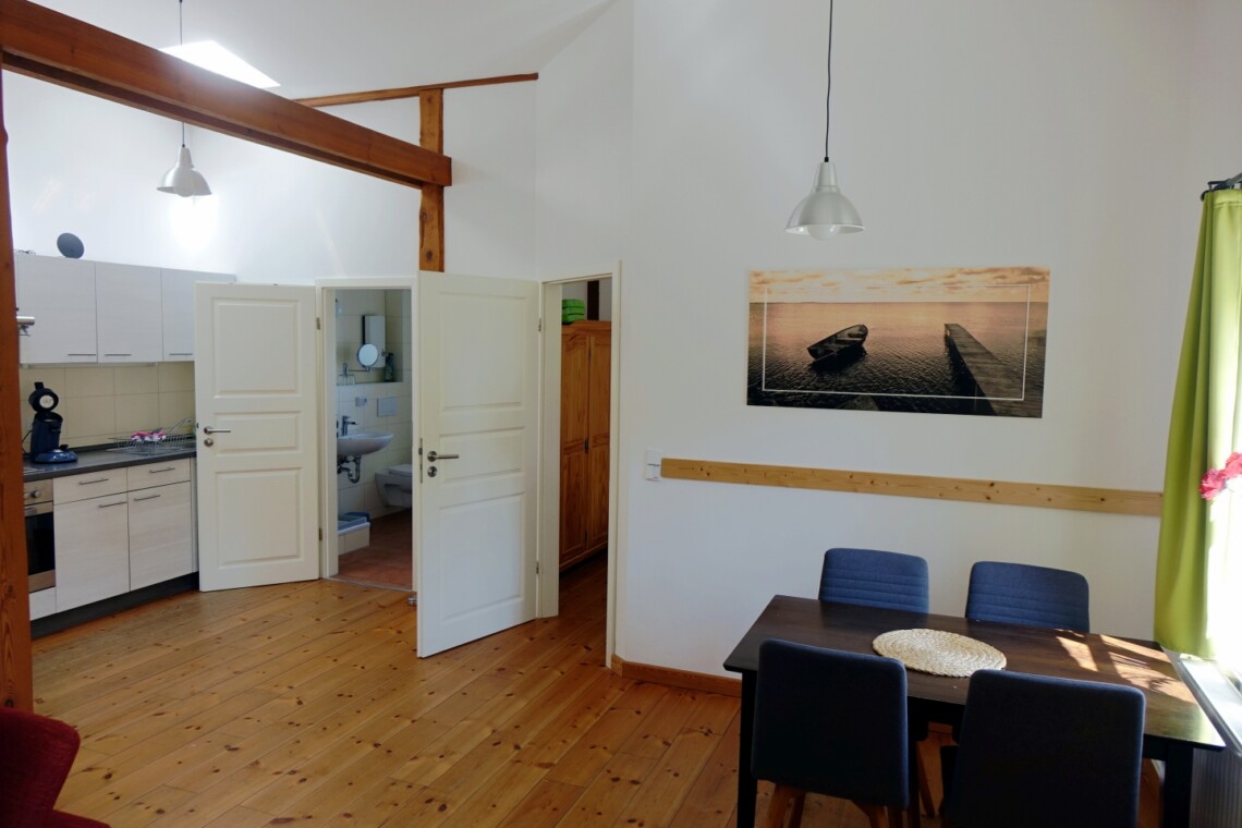 Die romantische Ferienwohnung befindet sich im Obergeschoss des ehemaligen Stallgebäudes und ist durch eine Außentreppe zu erreichen. Sie bietet einen wundervollen Ausblick über Wiesen und Felder, herrliche Sonnenuntergänge inklusive. Es steht Ihnen ein separates Wohnzimmer sowie ein Schlafzimmer zur Verfügung. Das Ehebett im Schlafzimmer ist mit zwei Matratzen und Lattenrosten in den Maßen von jeweils 80×200 cm ausgestattet. Eine weitere Schlafmöglichkeit bietet ein komfortables Schlafsofa (1,40×1,90m) im Wohnzimmer. Eine voll ausgestattete Küchenzeile mit Kühlschrank, Backofen, Kochfeld und einer Kaffeepad-Maschine ist vorhanden. Das Duschbad ist mit einem Haartrockner ausgestattet. Zur Unterhaltung stehen Sat-TV sowie eine Mini-Anlage mit Radio sowie CD- und USB-Funktion zur Verfügung. Kostenloses W-LAN ist selbstverständlich vorhanden. Für Gäste mit Kleinkindern stehen ein Hauck-Reisebett sowie ein Hochstuhl in der Wohnung bereit.